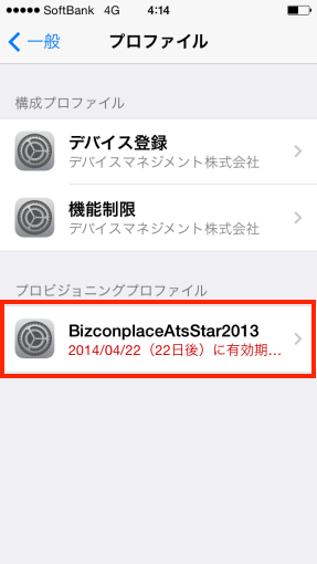 ・iOS 7以前のデバイスでは、「設定」-「一般」-「プロファイル」の順にタップして表示される画面で、プロビジョニングプロファイルが配信されていることを確認できます。