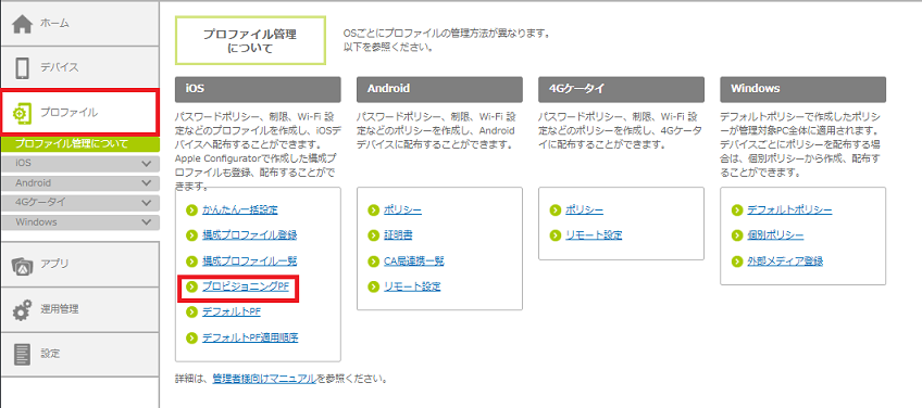 1.「プロファイル」をクリックし、「iOS」の「プロビジョニングPF」をクリックします。