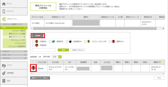 ・ステータスが「適用エラー」となっているデバイスに対してのみ、プロビジョニングプロファイルが再適用されます。