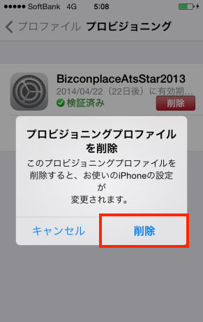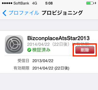 1.削除したいプロビジョニングプロファイルをタップし、表示される画面で「削除」ボタンをタップします。