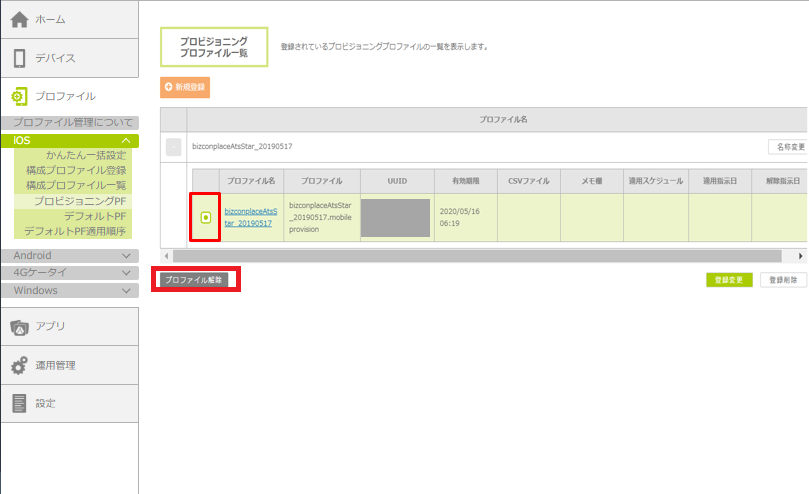管理サイトに登録したプロビジョニングプロファイルを削除する