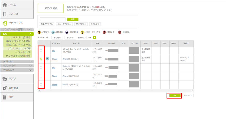 3.プロビジョニングプロファイルを削除したいデバイスを選択し、「OK」ボタンをクリックします。