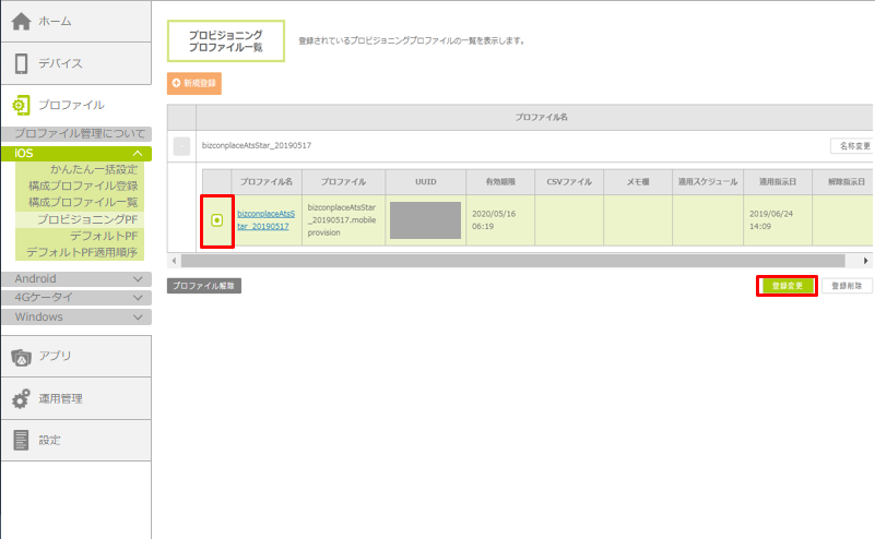 「プロビジョニングプロファイル一覧」画面が表示されます。