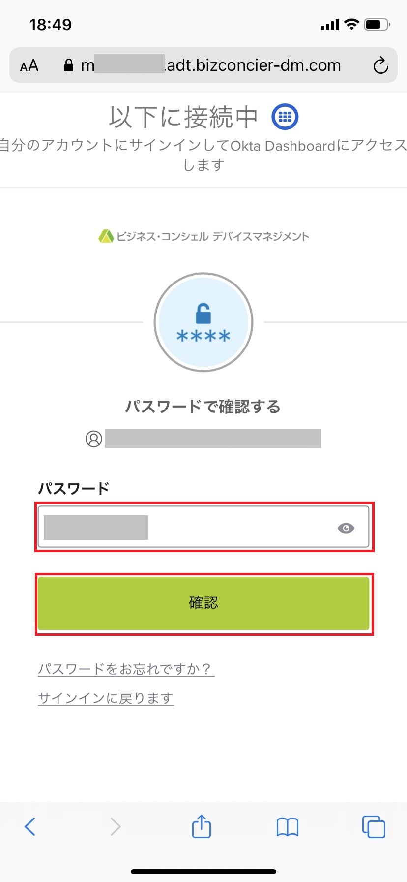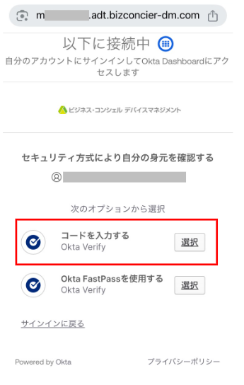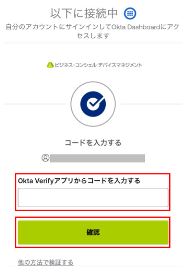 4.「Okta Verifyアプリからコードを入力する」に「Okta Verify」アプリに表示されているコード6桁を入力し「確認」ボタンをタップします。
