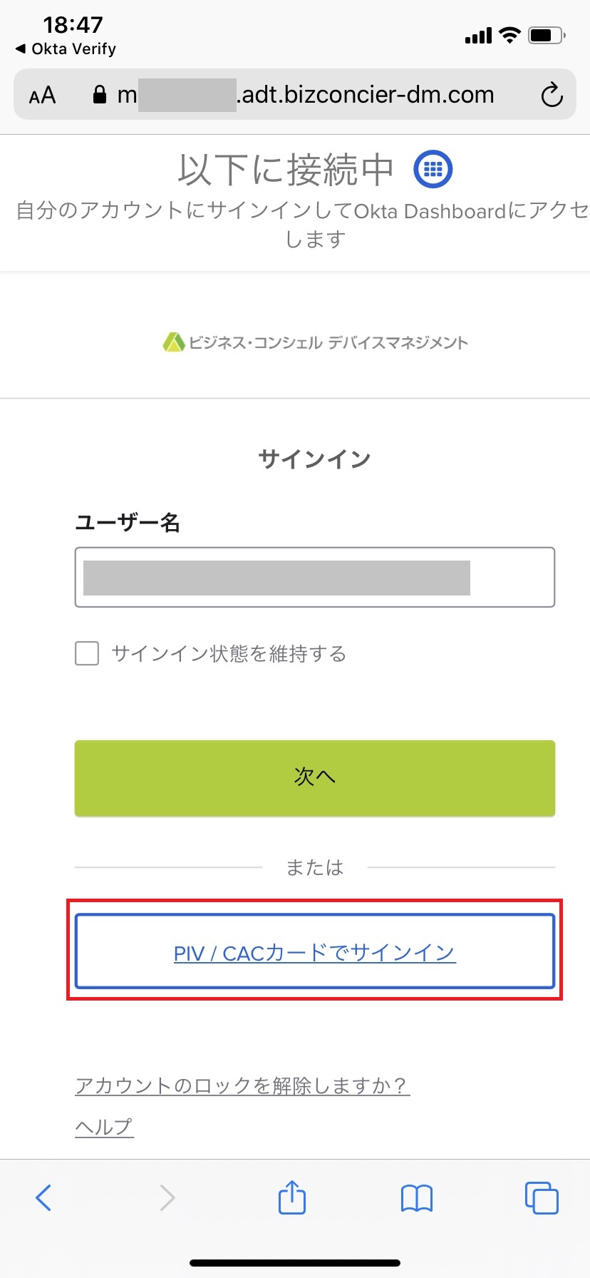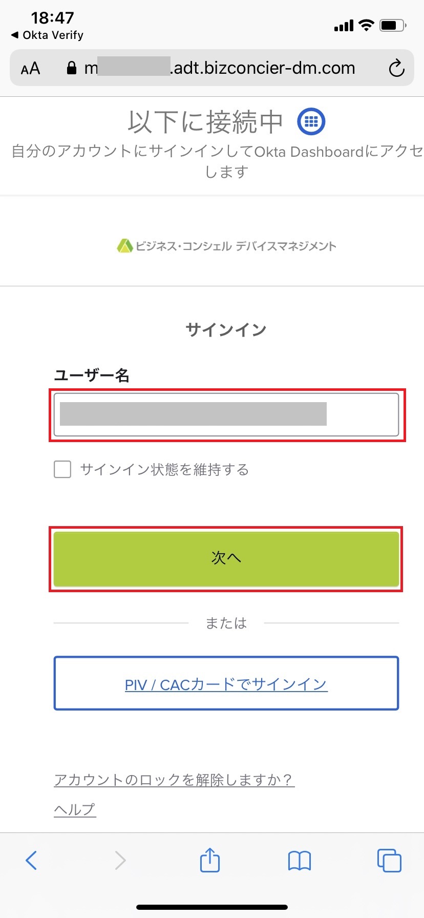 1.「サインイン」画面にユーザー名を入力して「次へ」ボタンをタップします。
