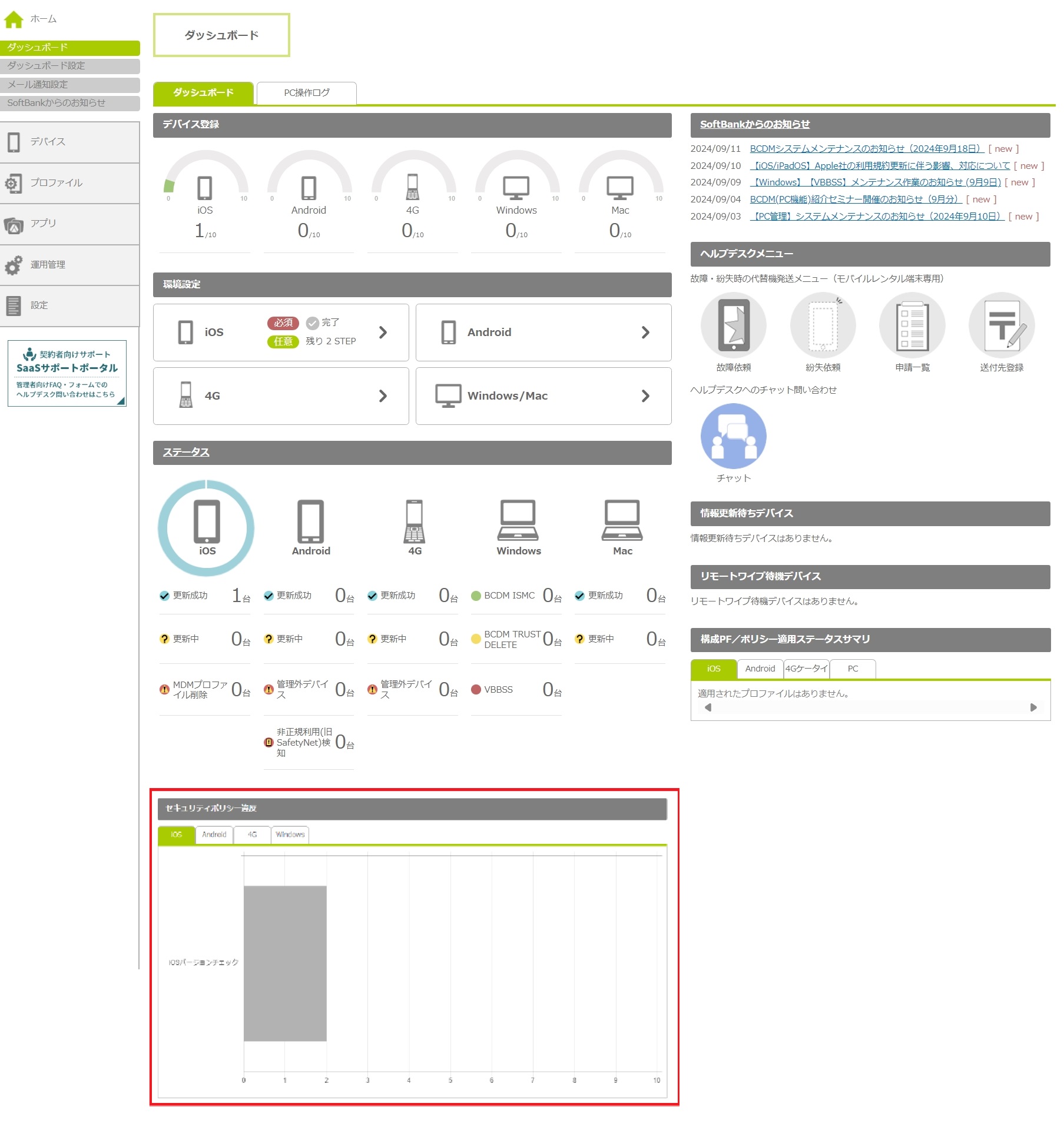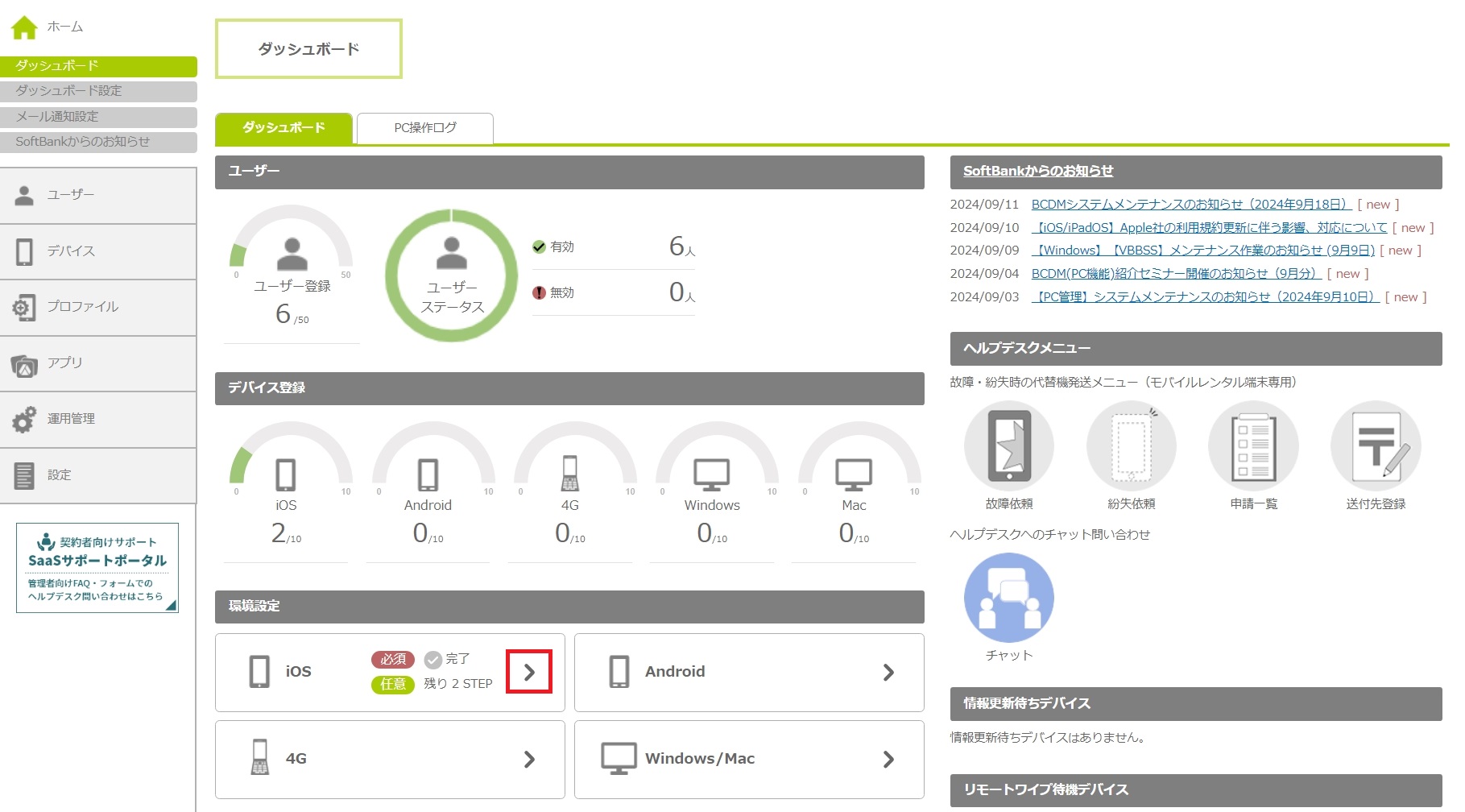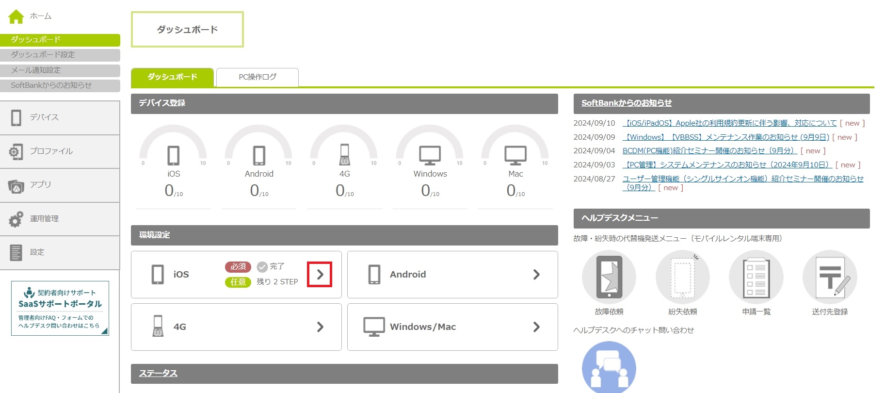 | ヘルプデスクメニュー | ヘルプデスクに関連するメニューを表示します。 デバイスが故障 / 紛失した場合の代替機発送申請機能や、チャットでのお問い合わせ機能へワンクリックで進むことができます。 | ||