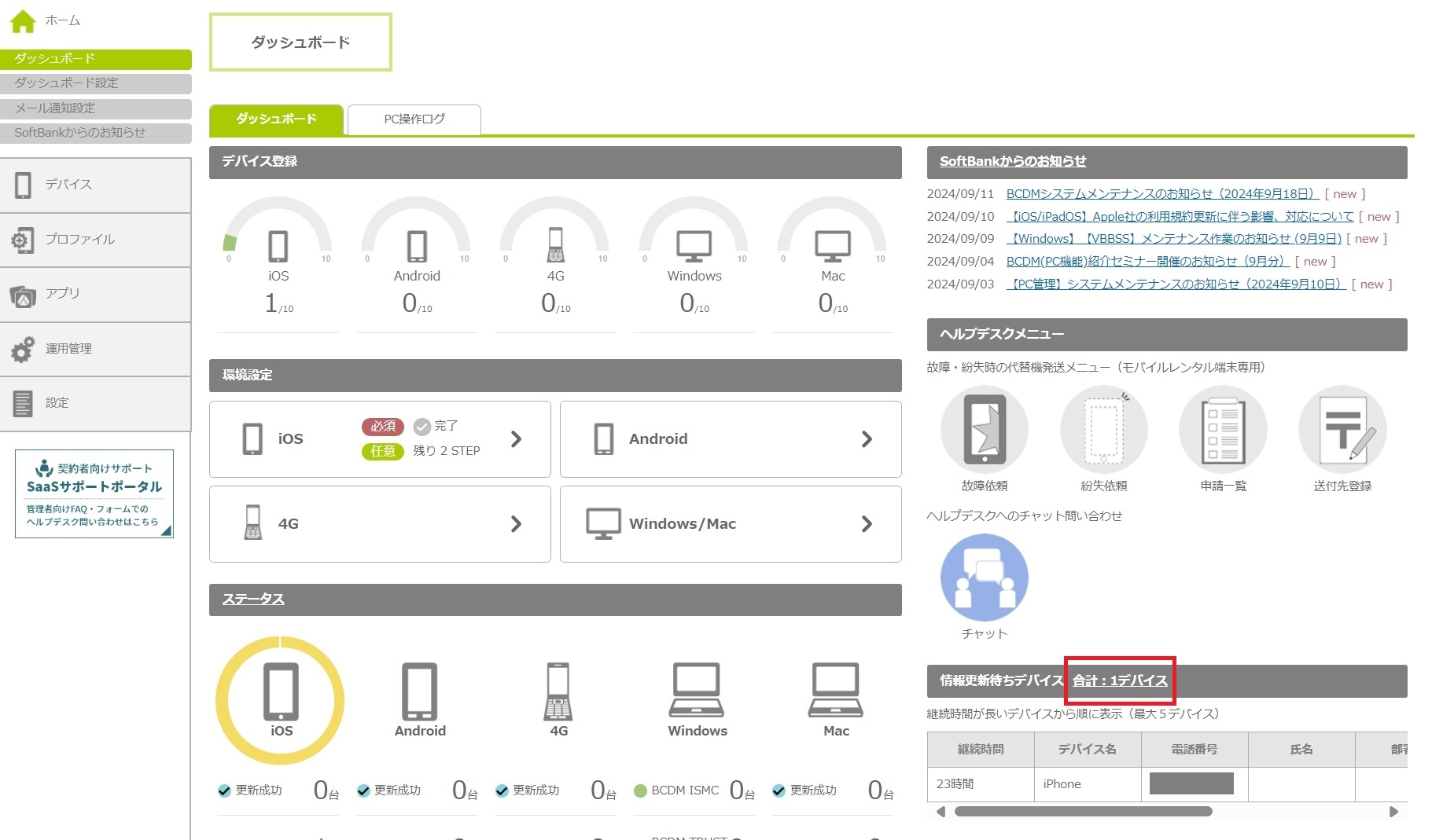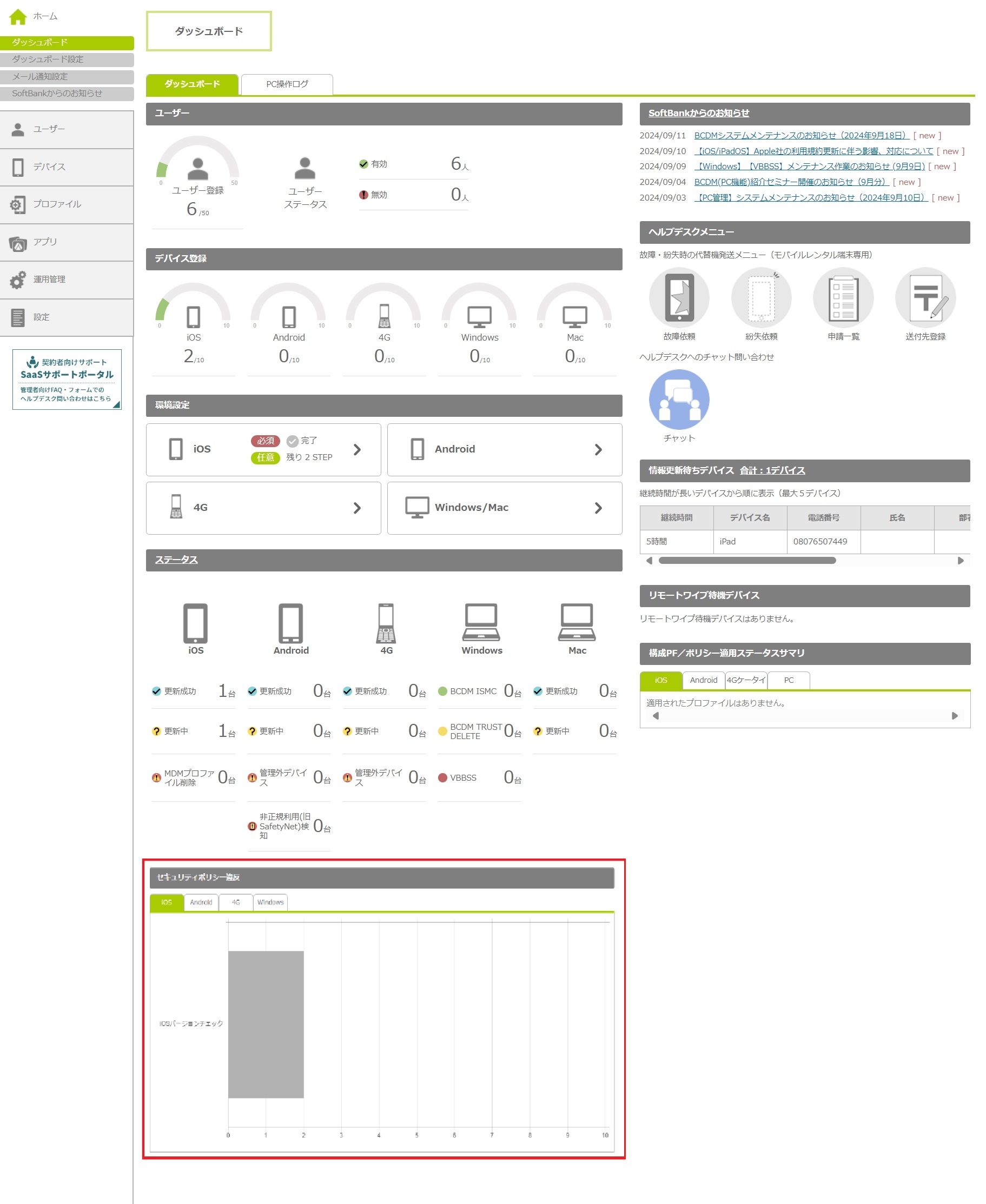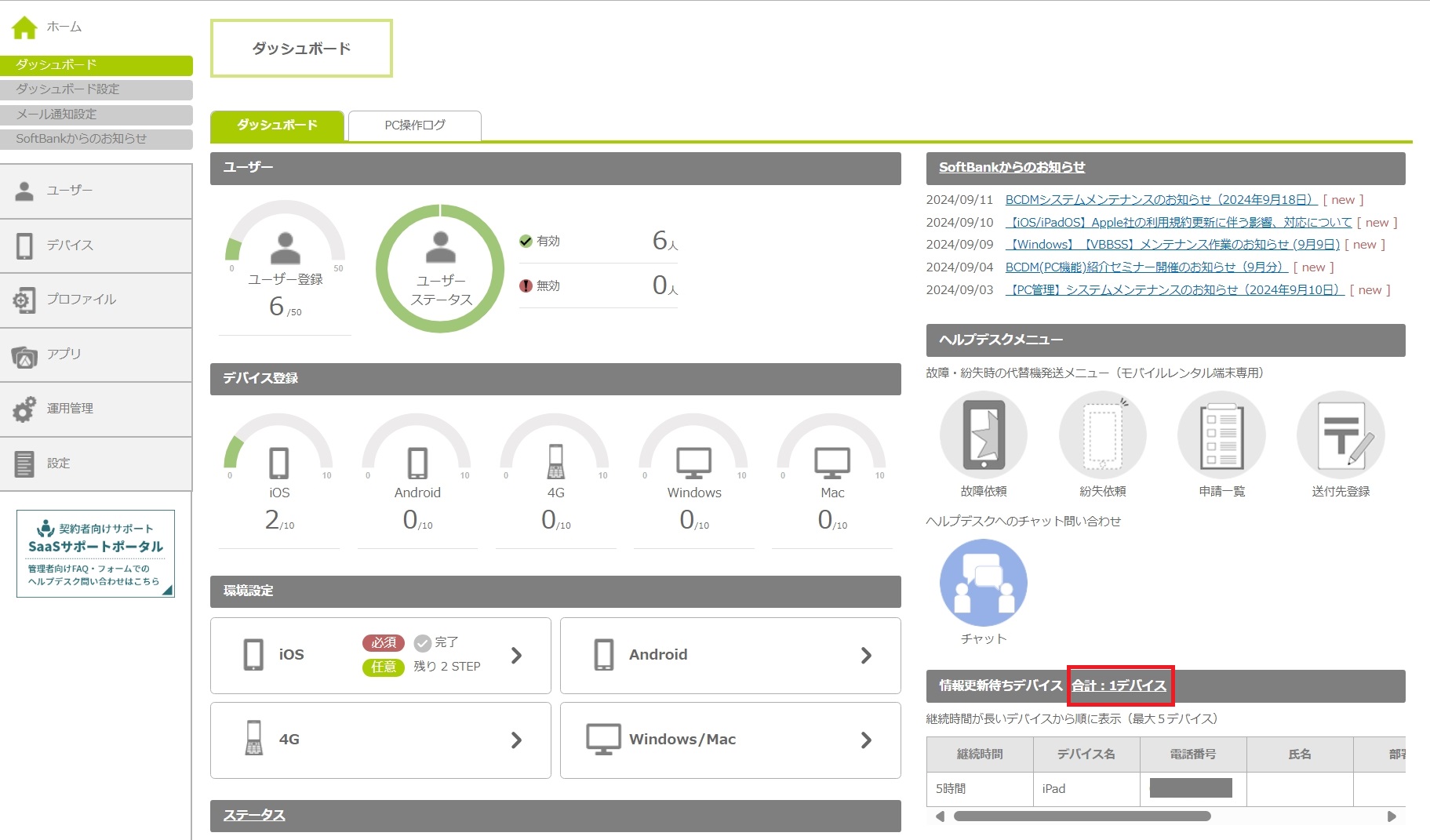 | デバイス登録 | iOSデバイス、Androidデバイス、4Gケータイ、Windows、Macの各デバイスについて、本サービスに登録されているデバイス数、およびお申し込みいただいた契約数が半円グラフで表示されます。 | ||
