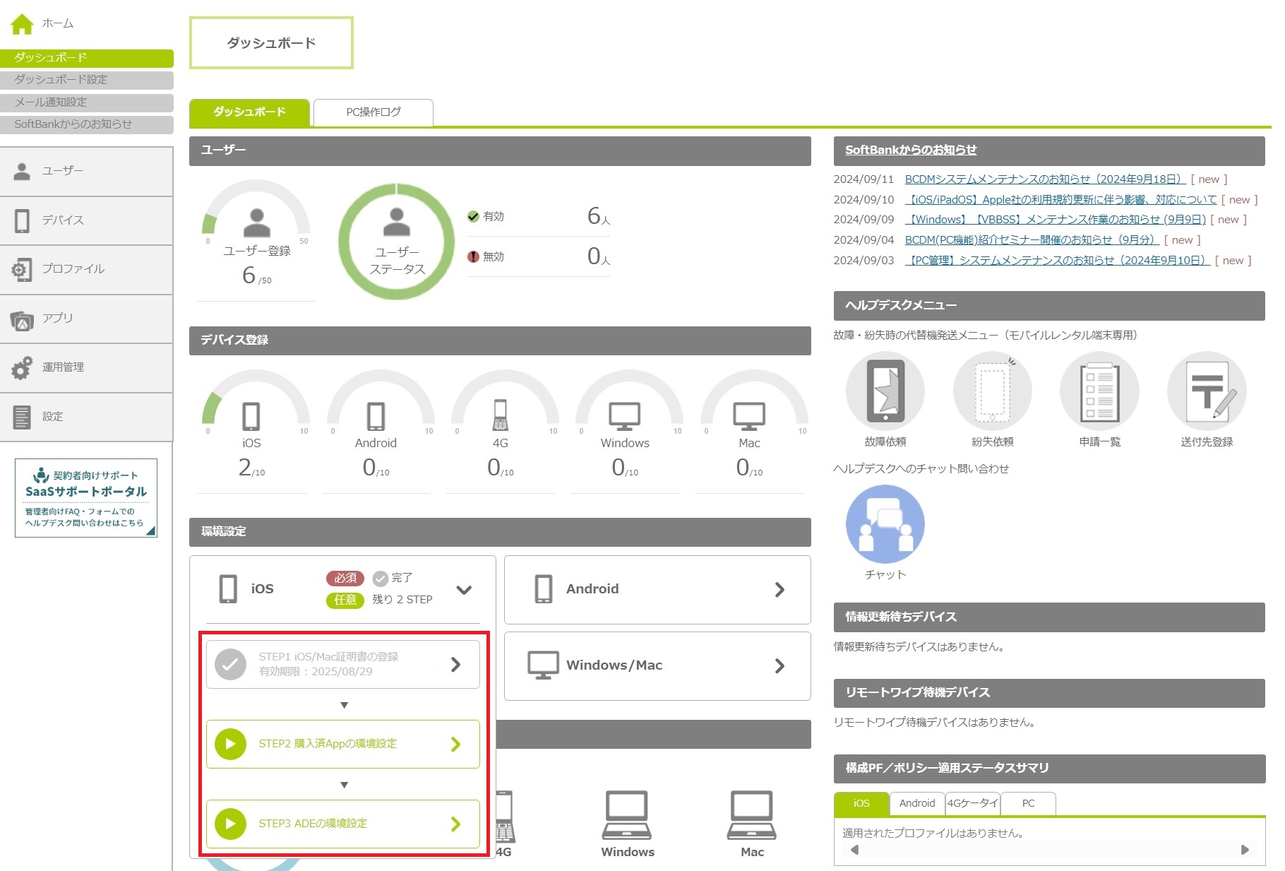 環境設定の各STEPの設定状況や、証明書の有効期限を確認することができます。