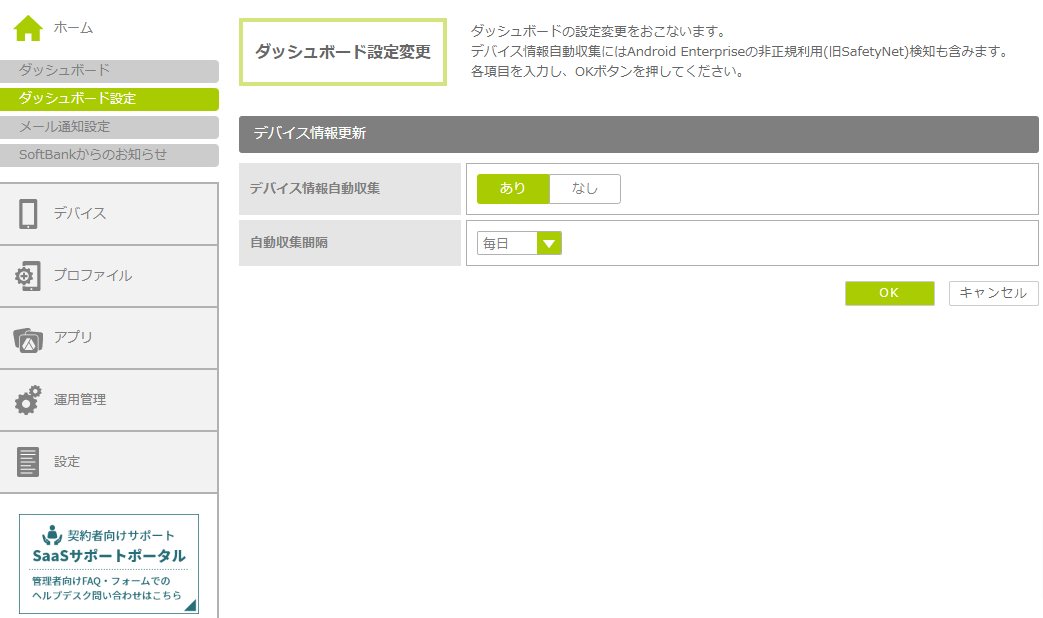 デバイス情報自動収集 デバイス情報を自動収集するかどうかを選択します。「あり」を選択した場合、「自動収集間隔」の項目が表示され、設定できます。