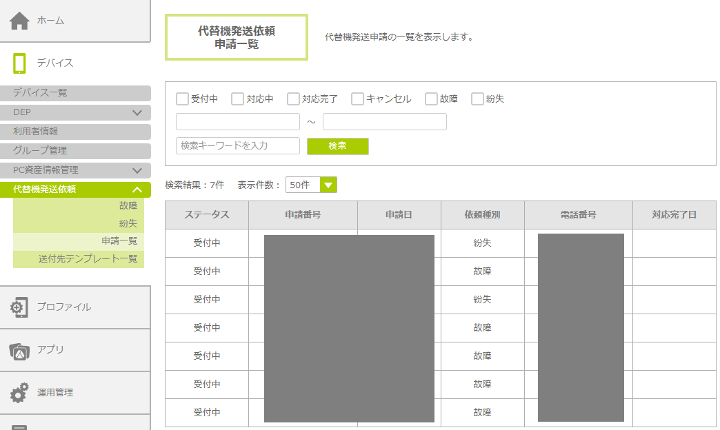 「代替機発送依頼申請一覧」画面で、代替機の発送依頼の申請状況を確認できます。