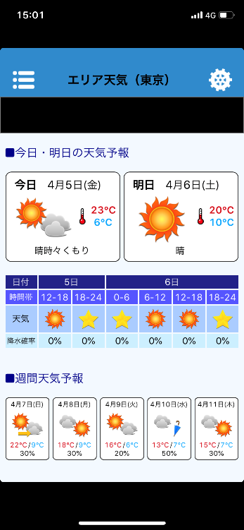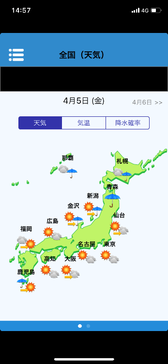・「天気」、「気温」、「降水確率」をタップすると、予報の表示を切り替えられます。