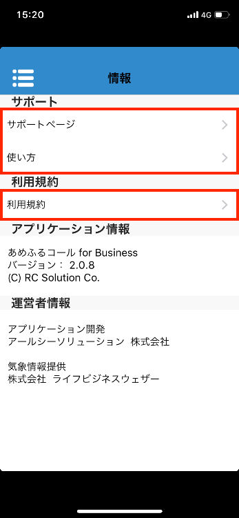 「あめふるコール for Business」のサポート情報や使い方、利用規約などを表示できます。