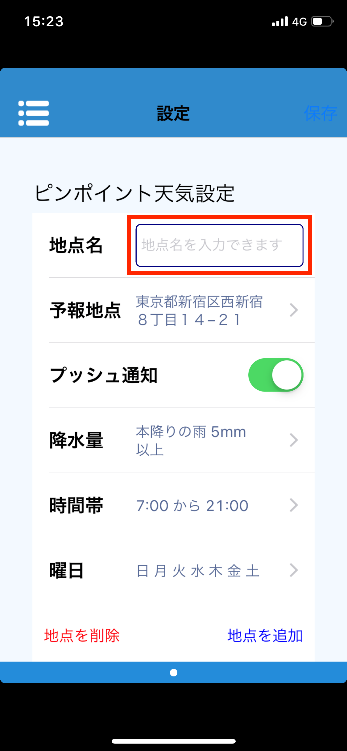 3. 「設定」画面が表示されたら、「地点名」を入力します。