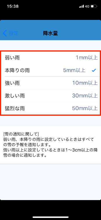 4. 「降水量」をタップし、通知する雨の強さを5段階から選択します。