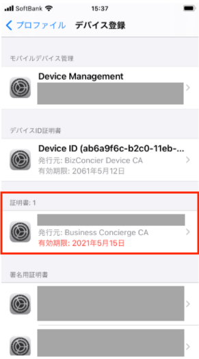 「証明書」に配布された証明書が表示されます。画像例はiPhone です。
