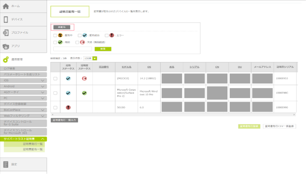 証明書配布一覧画面が表示されます。デバイスごとに証明書の状況が一覧表示されます。
