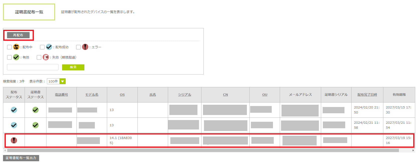 ここでは、証明書の配布がエラーになったデバイスに対して、再配布する方法について説明します。