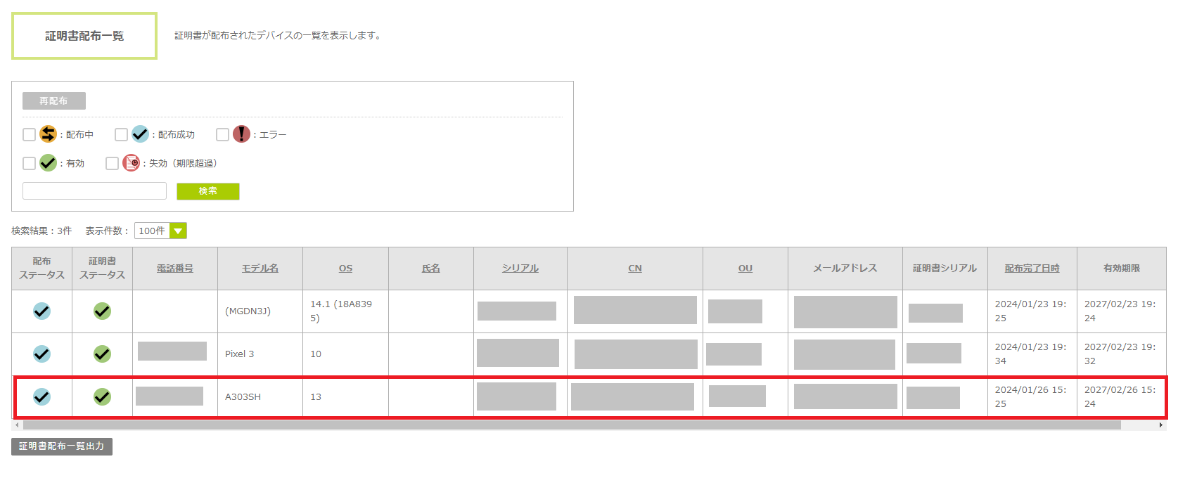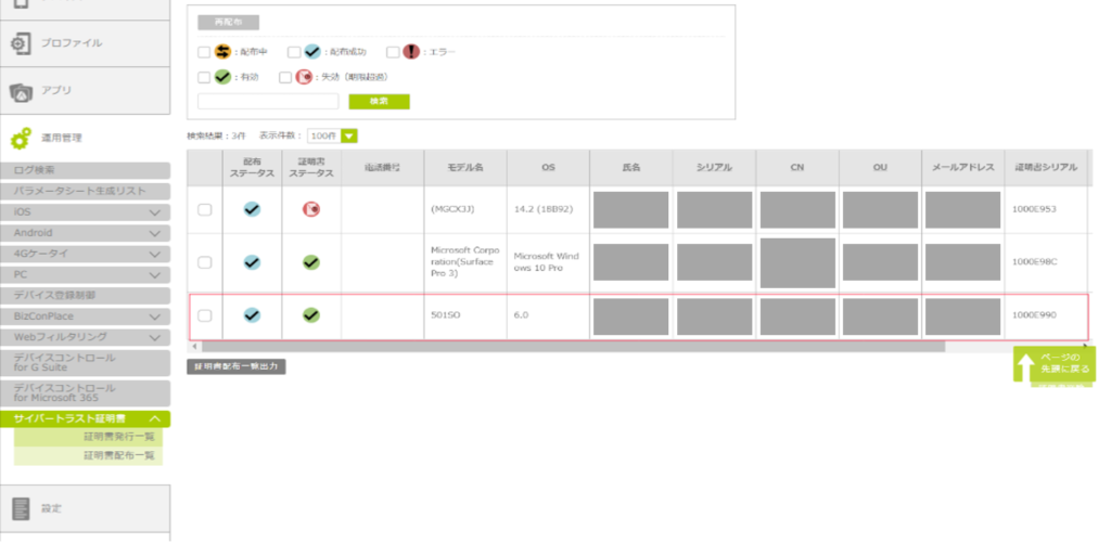 証明書配布一覧画面が表示されます。デバイスごとに証明書の状況が一覧表示されます。