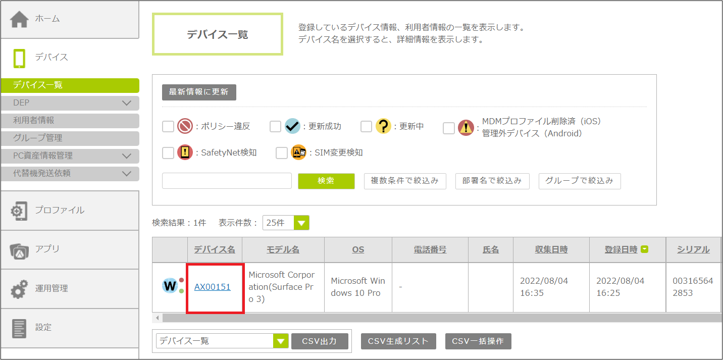 1. 「デバイス一覧」画面を表示し、リモートワイプを実行したいデバイス名をクリックします。