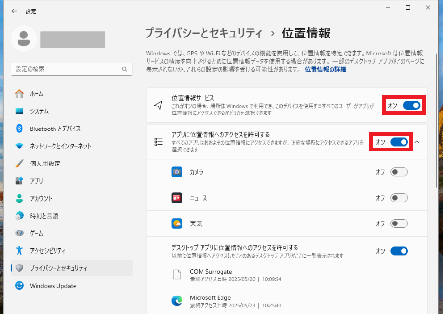 4. Windowsの設定アプリの「プライバシーとセキュリティ」-「位置情報」の画面の「位置情報サービス」と「アプリに位置情報へのアクセスを許可する」のスイッチを「オン」にします。
