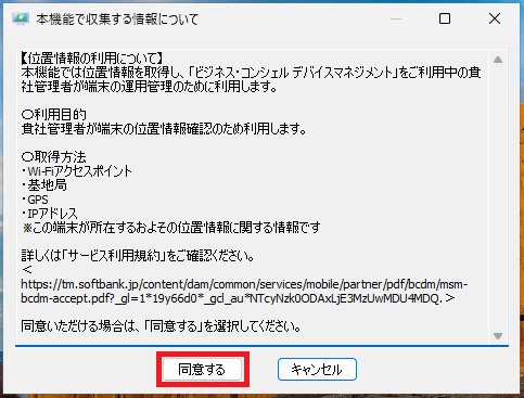 2. 「本機能で収集する情報について」画面の内容をご確認の上、「同意する」ボタンをクリックします。