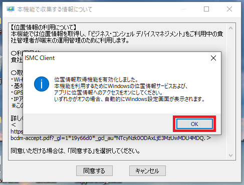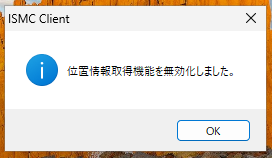 2. 「位置情報取得機能を無効化しました」のポップアップの「OK」ボタンをクリックします。