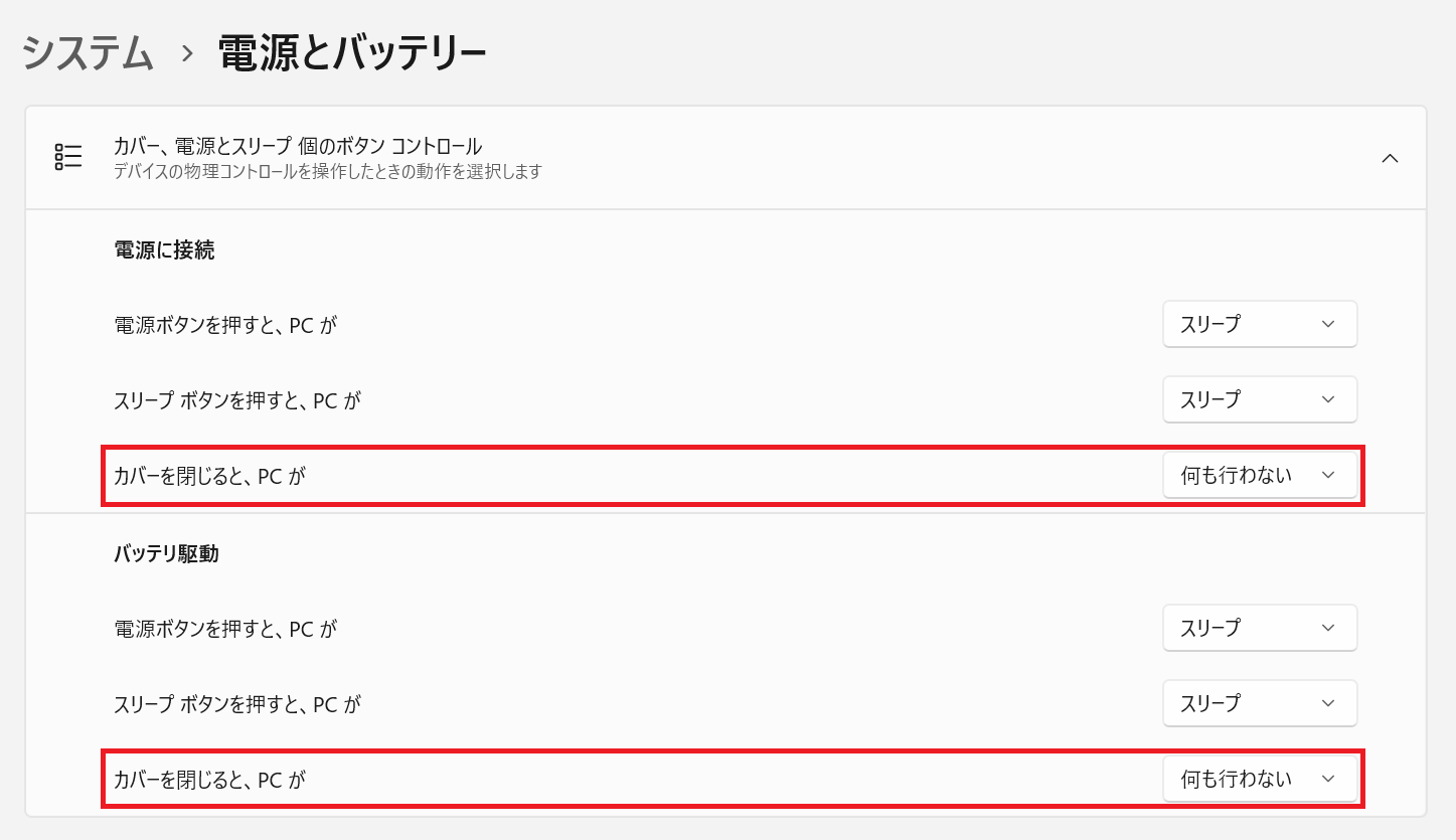 位置情報を取得するには ・Windowsデバイスの電源がオンでネットワークに接続されている必要があります。 ・スリープ状態または休止状態の場合、位置情報を取得できません。 移動中に位置情報を取得するには カバーを閉じてもスリープ状態や休止状態にならないようにするために、Windowsの「設定」から以下の両方の設定項目についてカバーを閉じたときの動作を「何もしない」に設定する必要があります。 ・「システム」>「電源とバッテリー」>「カバー、電源とスリープ 個のボタン コントロール」>「電源に接続」の「カバーを閉じると、PCが」を「何も行わない」に設定 ・「システム」>「電源とバッテリー」>「カバー、電源とスリープ 個のボタン コントロール」>「バッテリ駆動」の「カバーを閉じると、PCが」を「何もしない」に設定