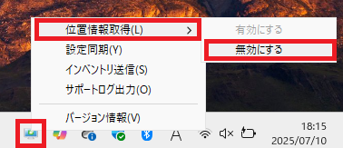 1. ISMCクライアントのアイコンを右クリックし「位置情報取得」にマウスオーバーするとさらにメニューが表示されますので、「無効にする」をクリックします。