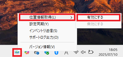 1. ISMCクライアントのアイコンを右クリックし「位置情報取得」にマウスオーバーするとさらにメニューが表示されますので、「有効にする」をクリックします。