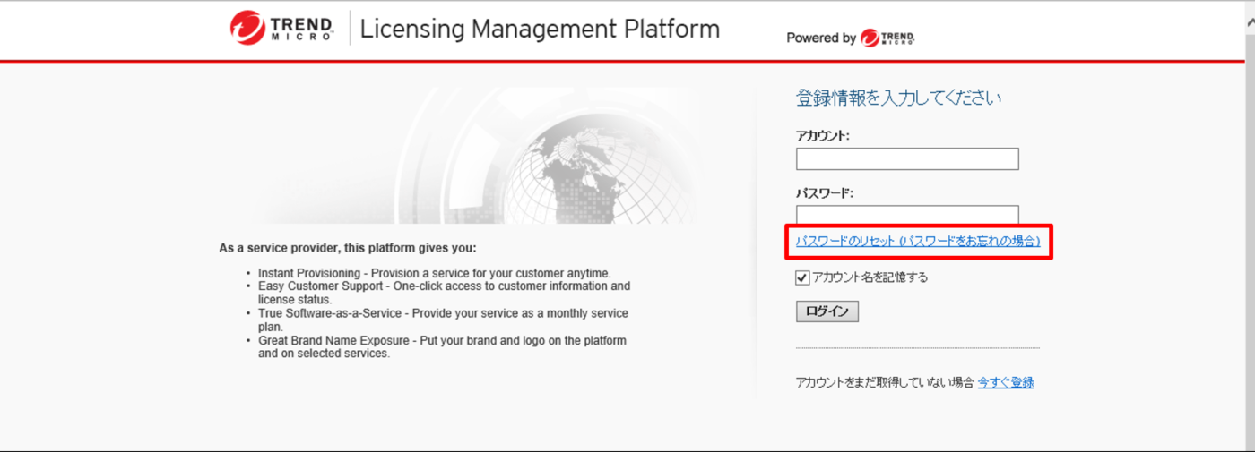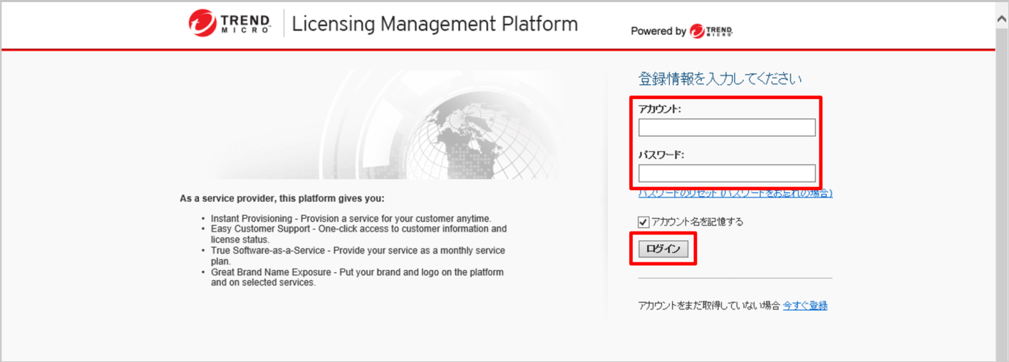 4. ウイルス対策ソフトの管理画面で、アカウントとパスワードを入力して、「ログイン」ボタンをクリックします。