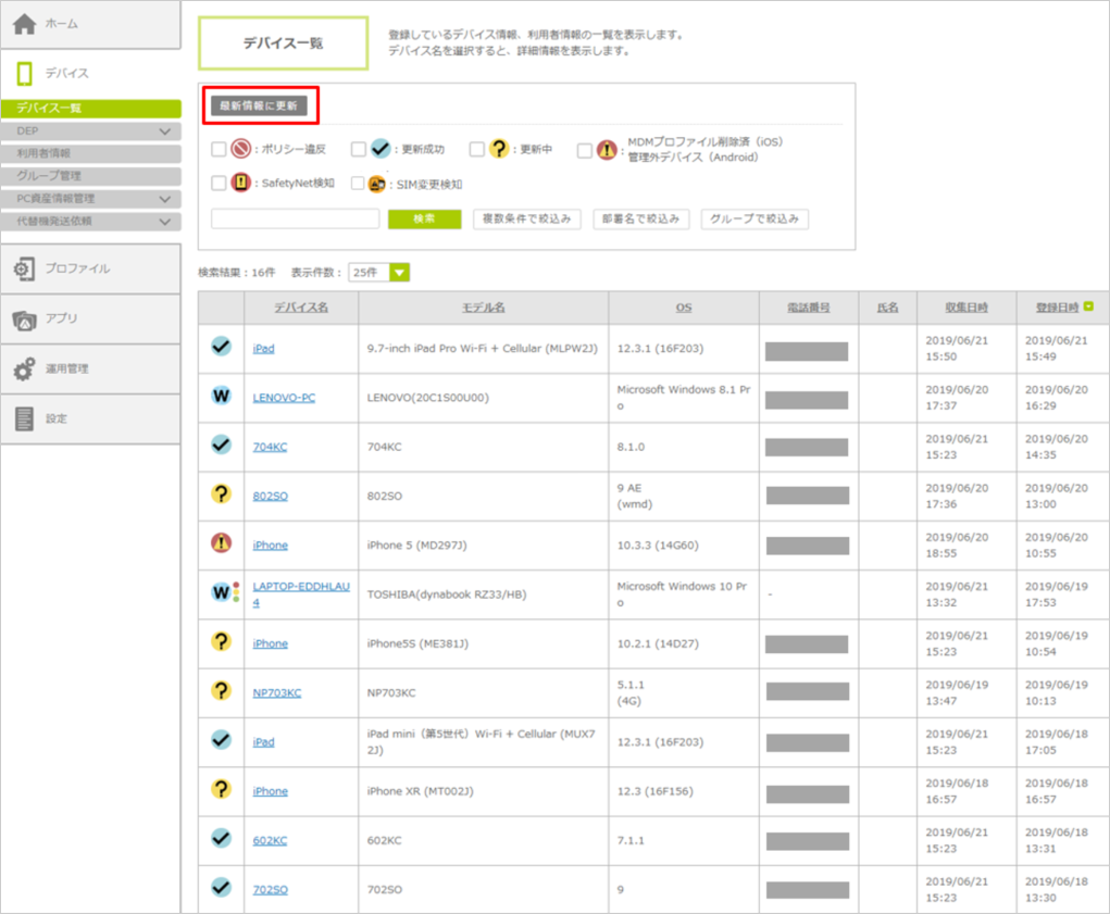 2. 管理サイトの「デバイス一覧」画面を表示し、「最新情報に更新」ボタンをクリックします。