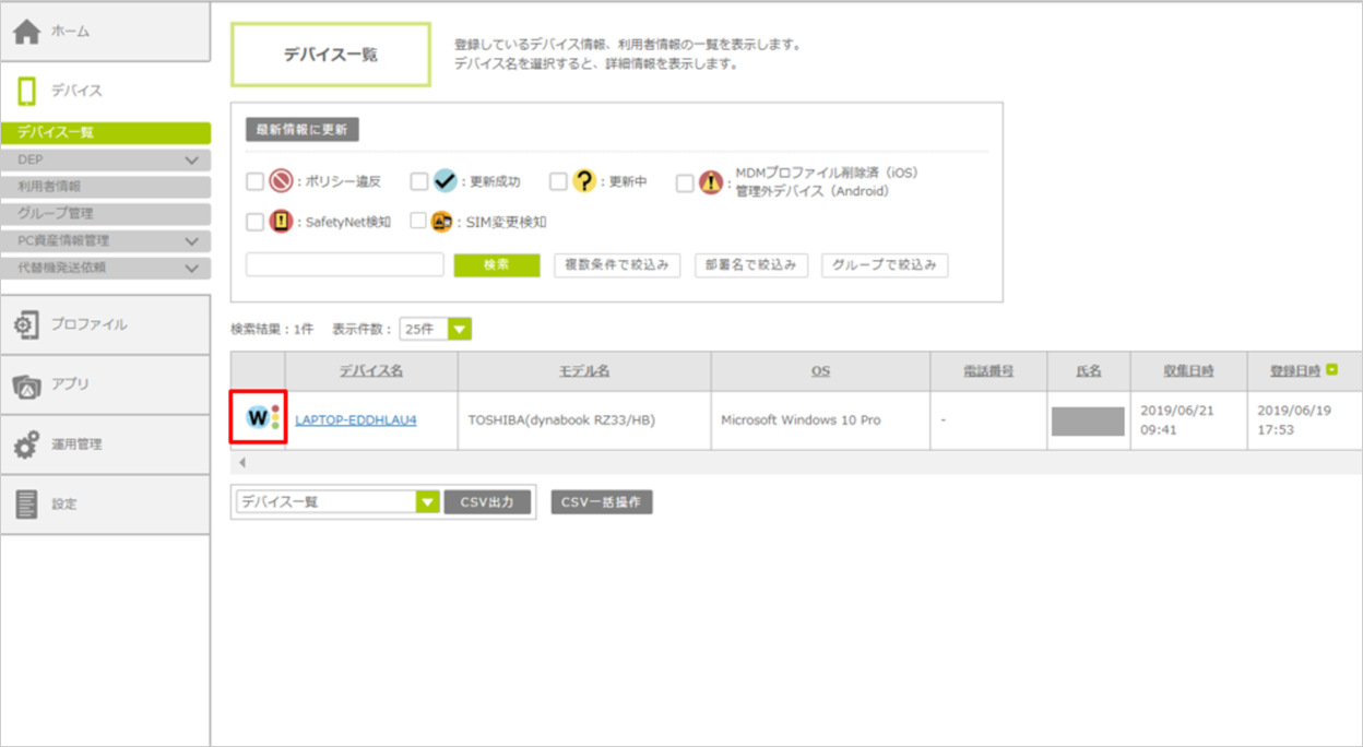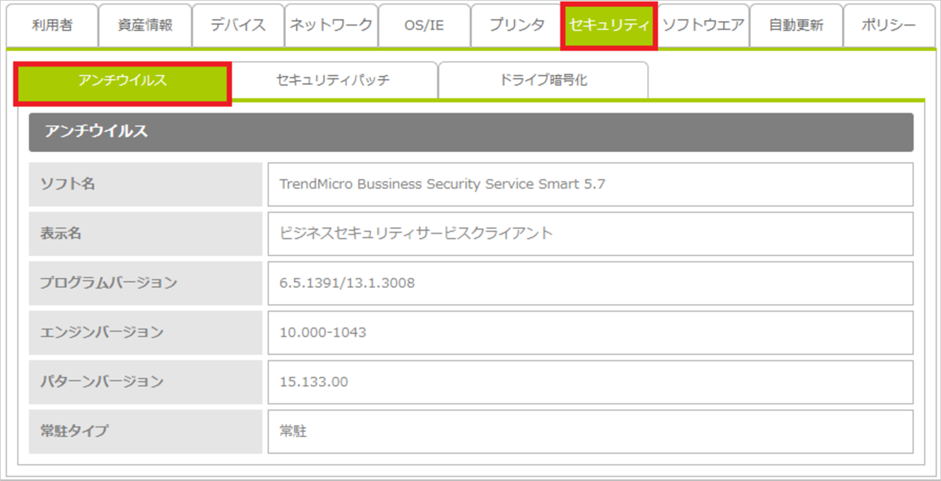 4. 「デバイス一覧」画面でデバイス名のリンクをクリックし、「セキュリティ」タブにアンチウイルス詳細情報が表示されるのを確認します。