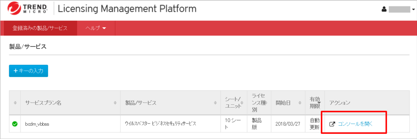 5. 「製品/サービス」の「bcdm_vbbss」の「コンソールを開く」をクリックします。