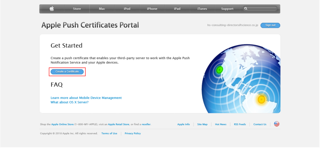 Apple社のApple Push Certificates PortalのWebサイトでMDM証明書を作成します。MDM証明書の作成には、取得したCSRファイルを使用します。