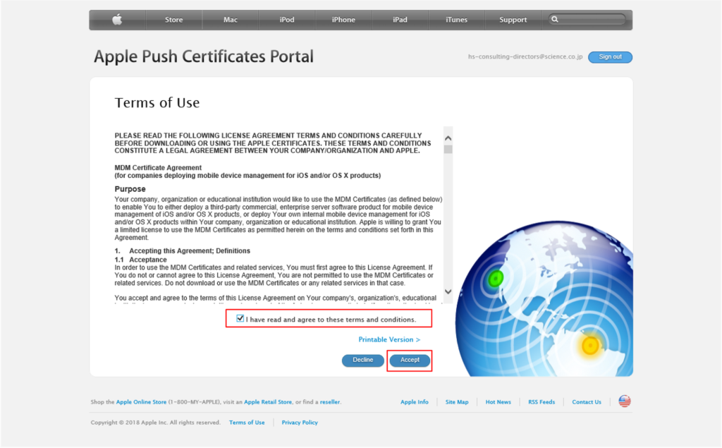 5. MDM Certificate Agreement(利用規約)の内容を確認し、同意する場合はチェックを入れて、「Accept」ボタンをクリックします。