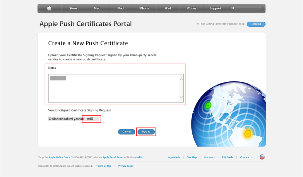 6. 「Notes」に登録通知書に記載されているDMコードを入力します。「参照」ボタンをクリックし、取得したCSRファイルを選択して、「Upload」ボタンをクリックします。