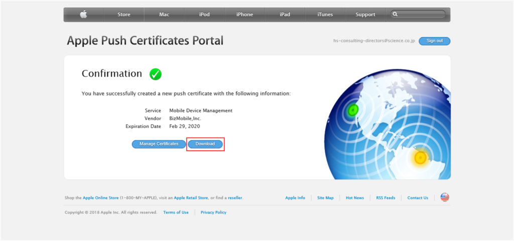 7. 「Download」ボタンをクリックし、MDM証明書をダウンロードします。