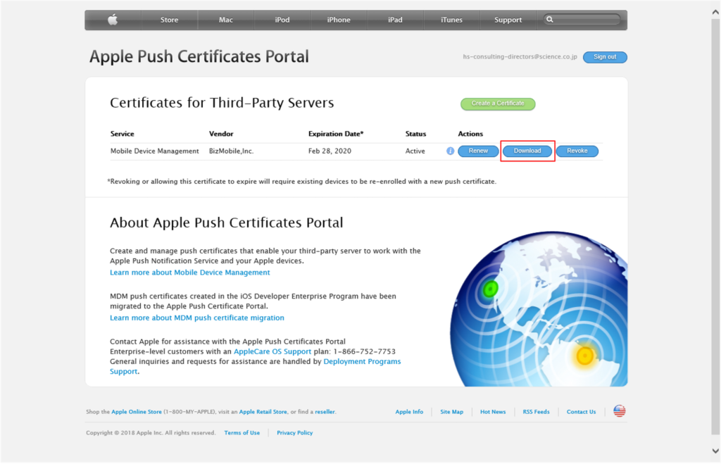 作成したMDM証明書は、有効期限内であればApple Push Certificates PortalのWebサイトで再ダウンロードできます。