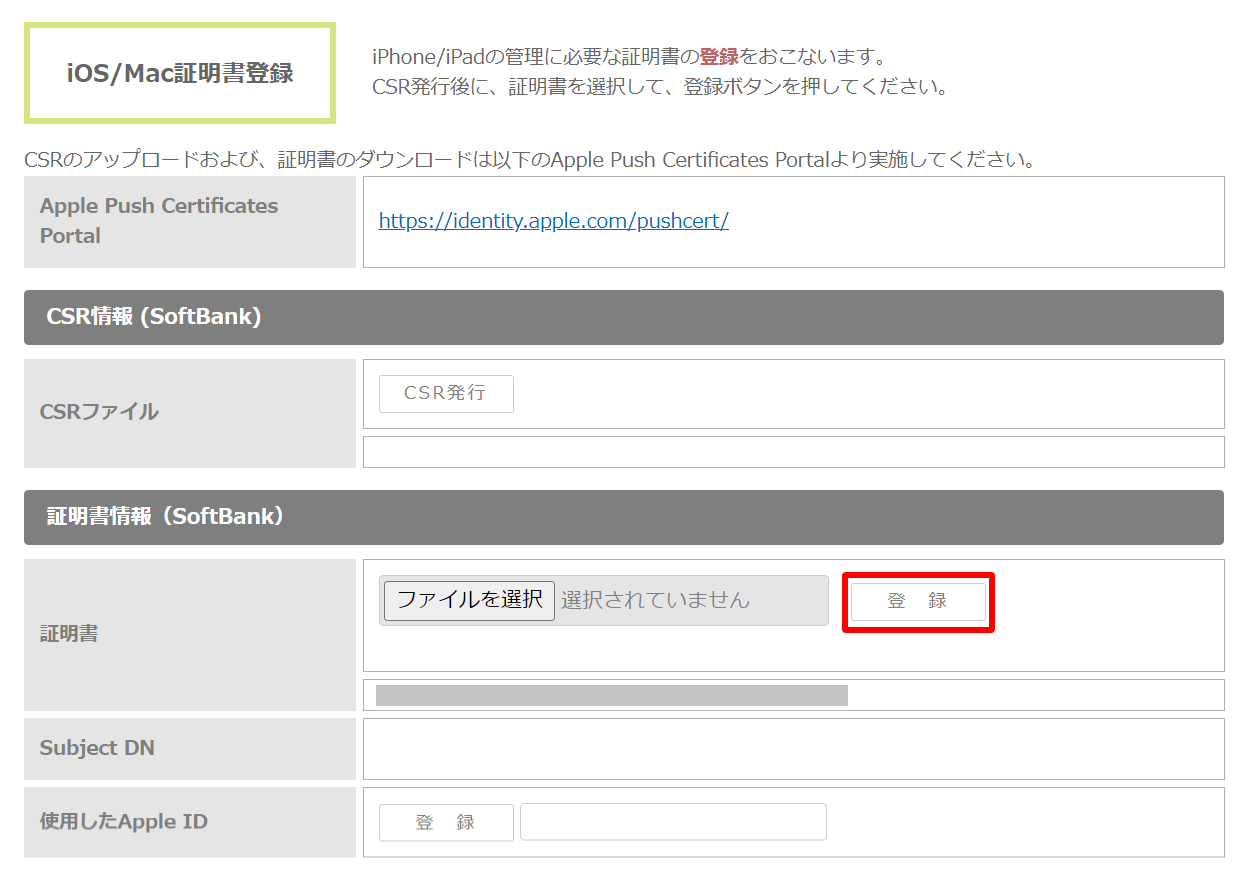 ダウンロードしたMDM証明書を管理サイトに登録します。