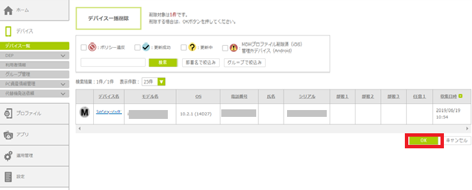 5. 削除対象のデバイスを確認し、「OK」ボタンをクリックします。