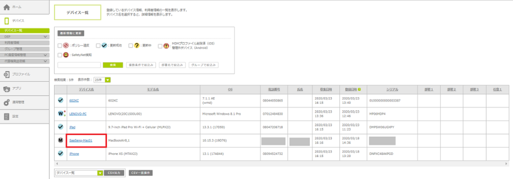 1. 「デバイス一覧」画面を表示し、詳細情報を確認したいデバイス名をクリックします。