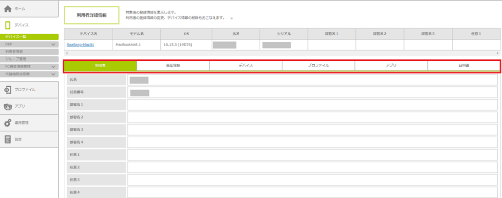 | 料金負担部署 | デバイスのリース・レンタル費用を負担している部署が表示されます。 |