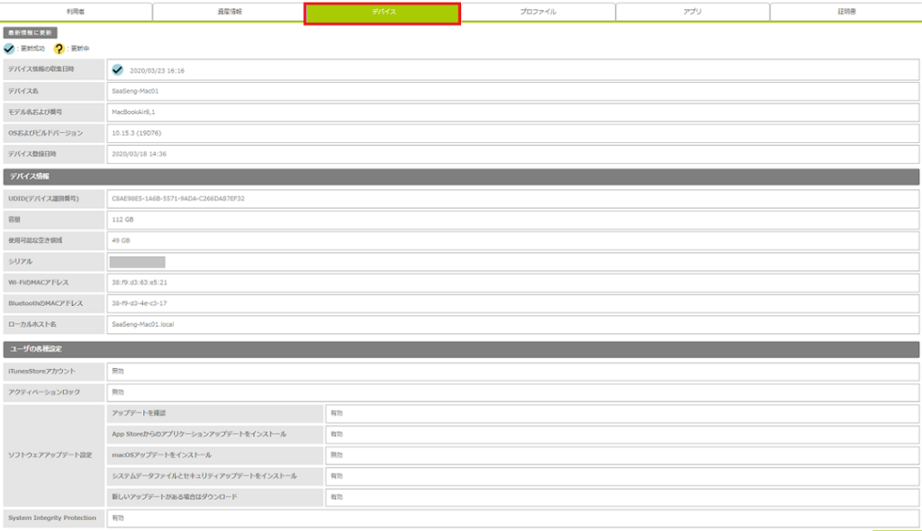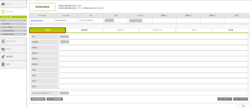 | システムロックPINコード | Macデバイスがリモートロック・ワイプされた状態で、端末を起動させるために必要なコードが表示されます。 |