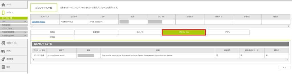 デバイスにインストールされている構成プロファイル、およびプロビジョニングプロファイルの一覧が表示されます。