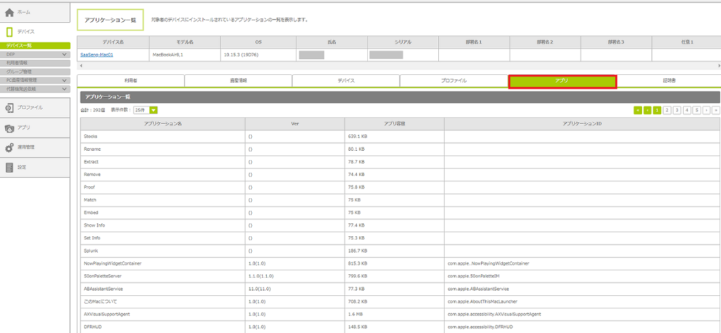| アプリケーション | デバイスにインストールされているアプリケーションの一覧が表示されます。 | アプリケーション一覧 |