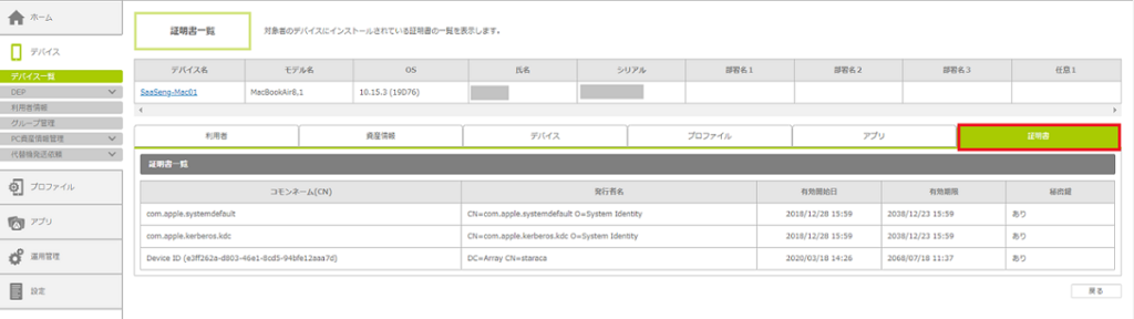 | 証明書 | デバイスの証明書情報が表示されます。 | 証明書情報 |