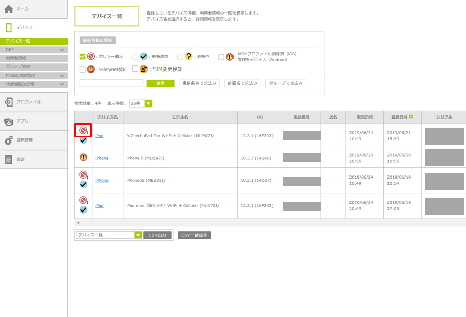 セキュリティポリシーのチェックが行われ、セキュリティポリシー違反があった場合は「デバイス一覧」画面や個別設定項目などにポリシー違反のステータスアイコンが表示されます。