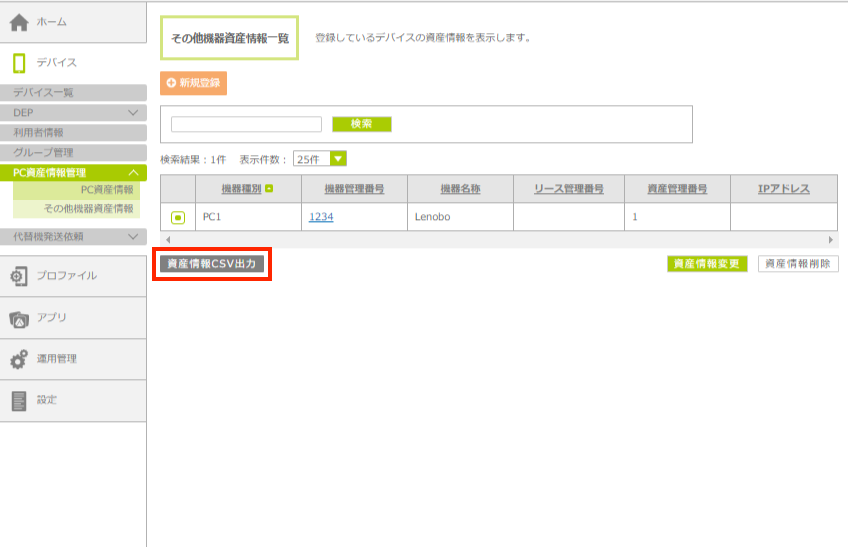 その他機器の資産情報の一覧をCSV形式のファイルに出力できます。