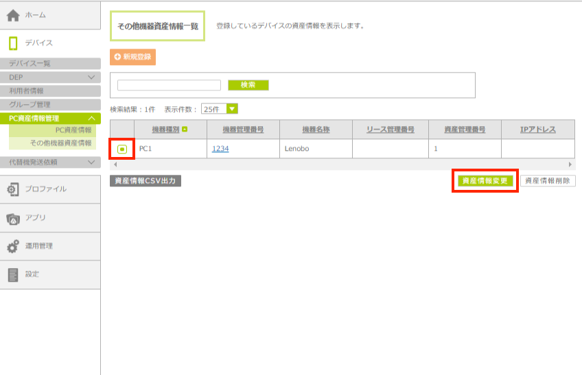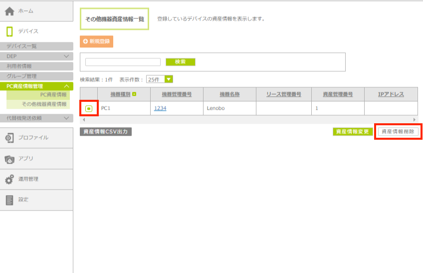 1. 「その他機器資産情報一覧」画面を表示し、資産情報を削除したい機器を選択して、「資産情報削除」ボタンをクリックします。
