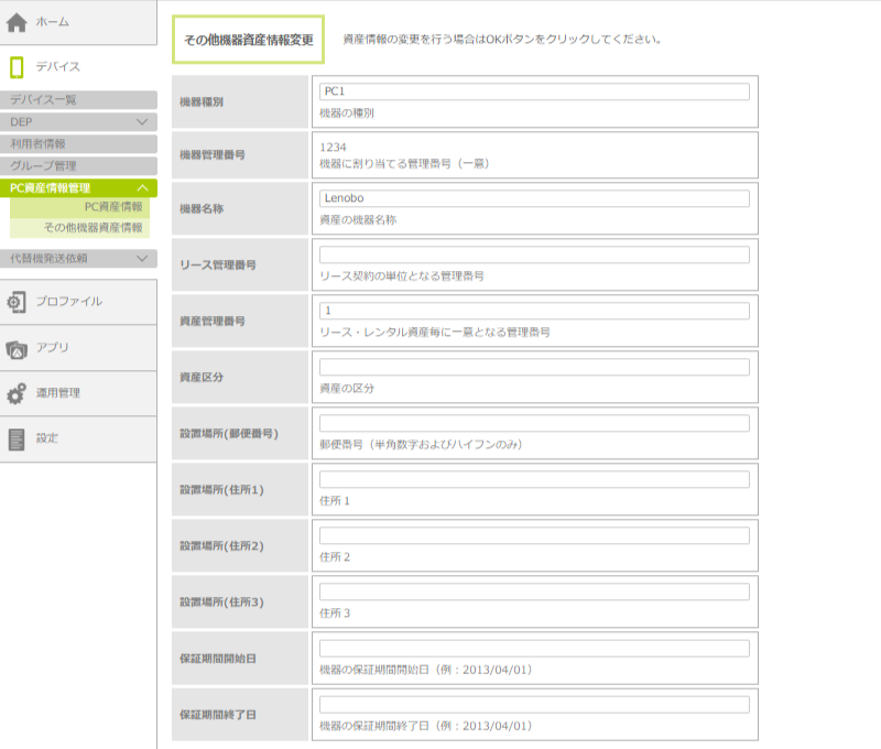 ここでは、その他機器の資産情報を登録する方法、登録したその他機器の資産情報を一覧で確認する方法やCSVファイルに出力する方法、資産情報の設定内容を変更・削除する方法などを説明します。